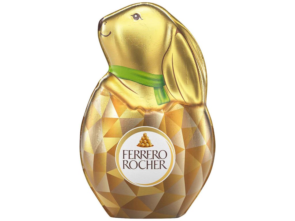 Sofistikovaný dekorační prvek pro velikonoční košík. Velikonoční zajíček Ferrero Rocher kombinuje jemnou mléčnou čokoládu s kousky lískových oříšků – inspirováno klasickým zážitkem z Ferrero Rocher.