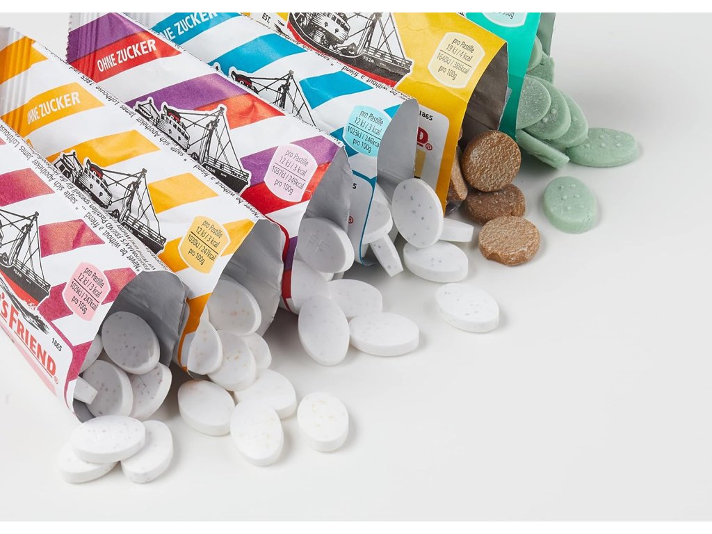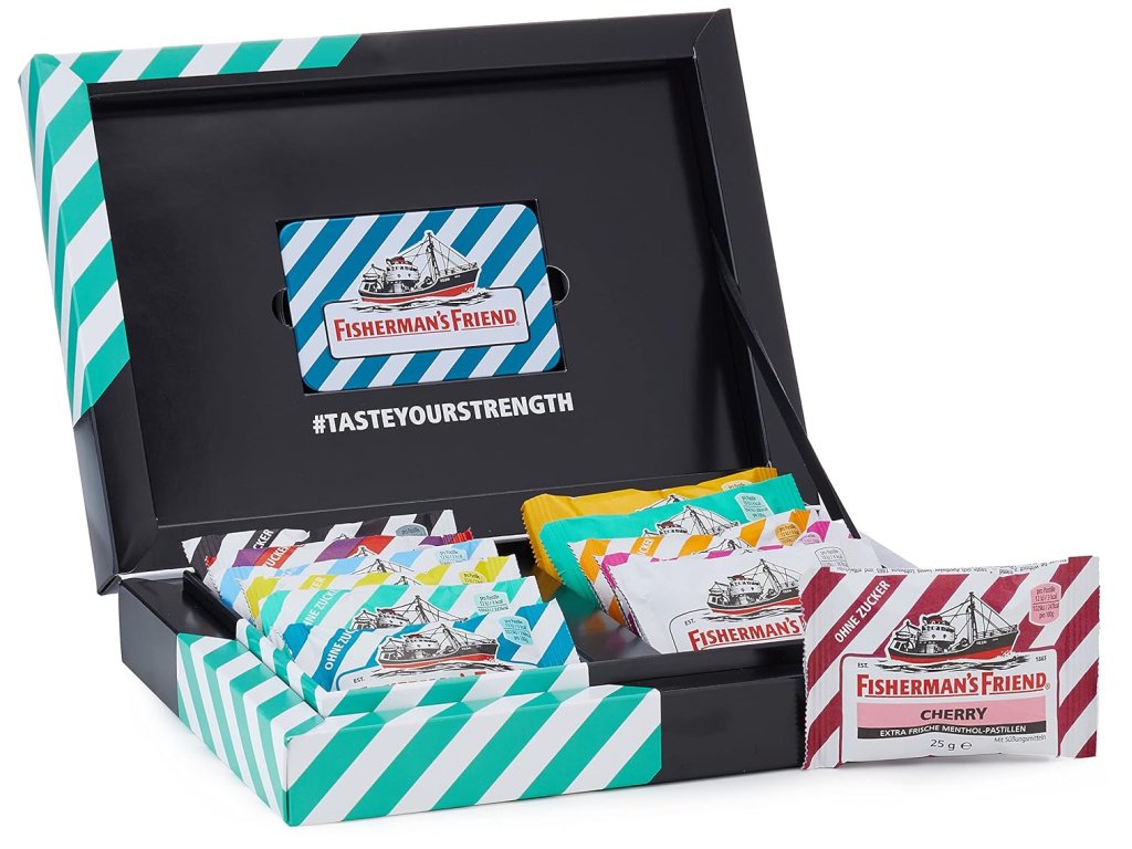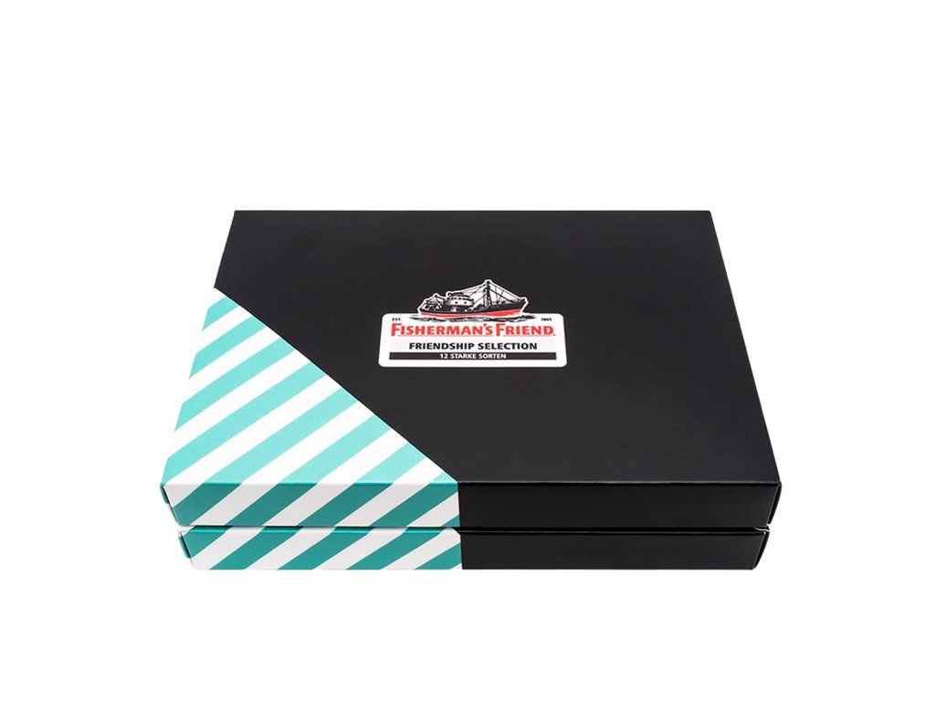 Název produktu Kolekce Fisherman's Friend's Friendship: Exkluzivní krabička s 12 různými druhy pastilek s plechovkou.