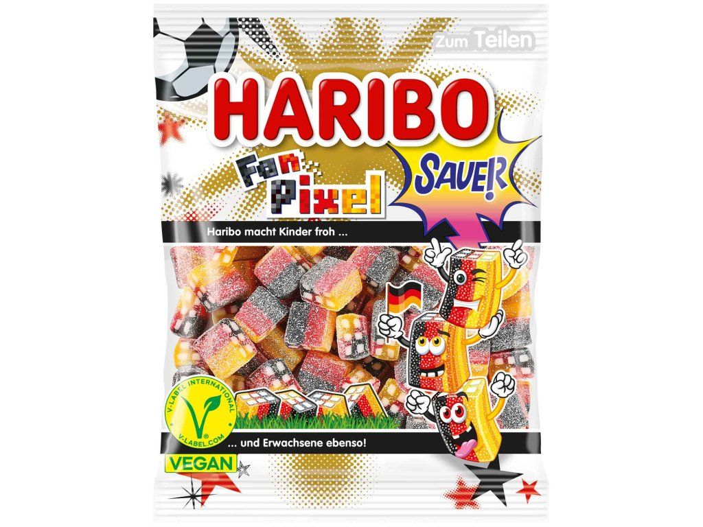 cukru a měkkou texturou. Haribo Fan Pixel Sauer 160g - veganské obsahují ovocné a rostlinné koncentráty a jsou vyrobeny