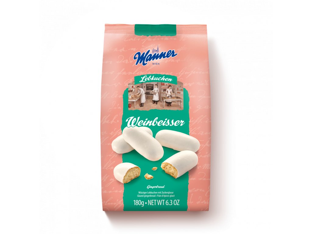 Podlouhlé Weinbeisser jsou pikantní perníková klasika od Manner. Pokryté jemnou polevou z bílého cukru chutnají