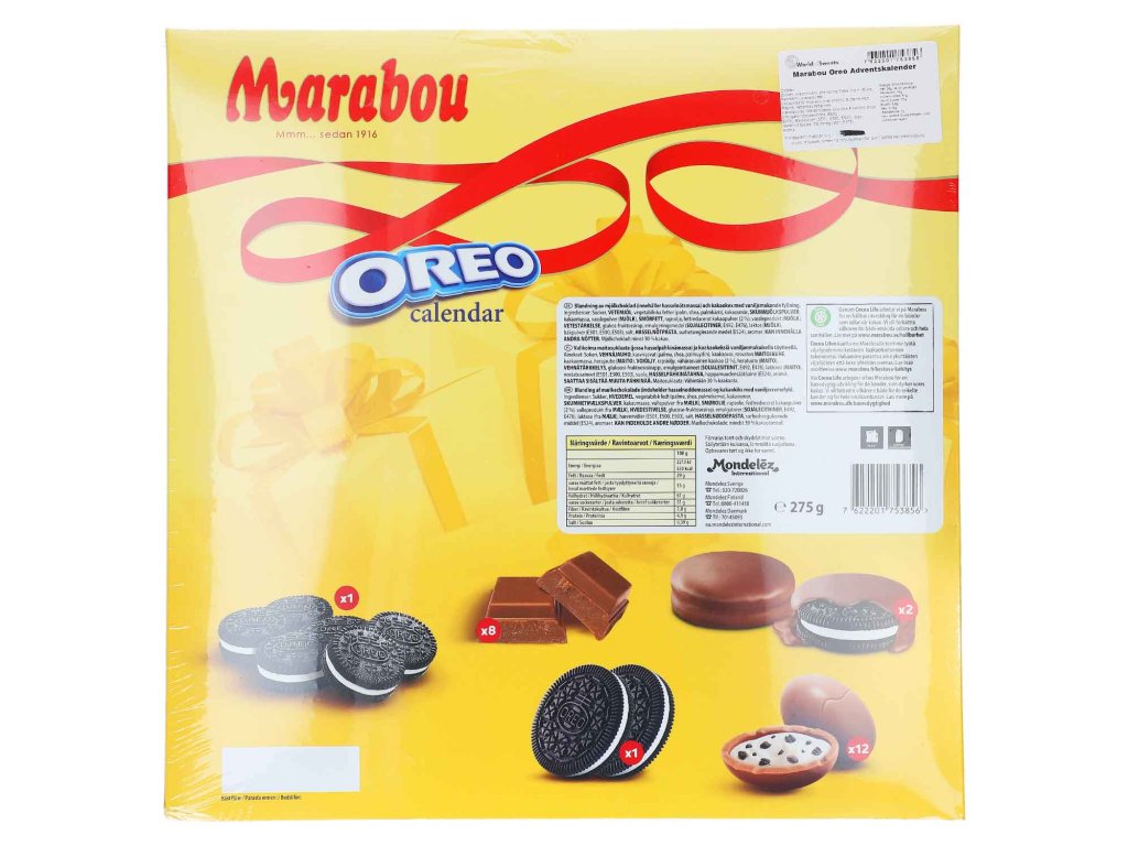 Velký XXL kalendář je naplněn lahodnými Oreo, ke kterým jsou chutná čokoládová vajíčka a čokoládové tyčinky z Marabou