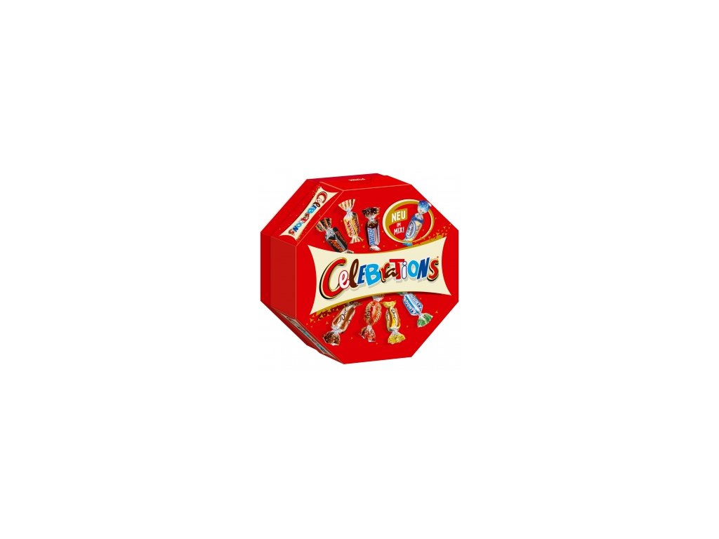 Celebrations je pestrá směs populárních značek čokolád: Mars, Snickers, Bounty, Milky Way, Twix. Dove, Dove Caramel a Maltesers