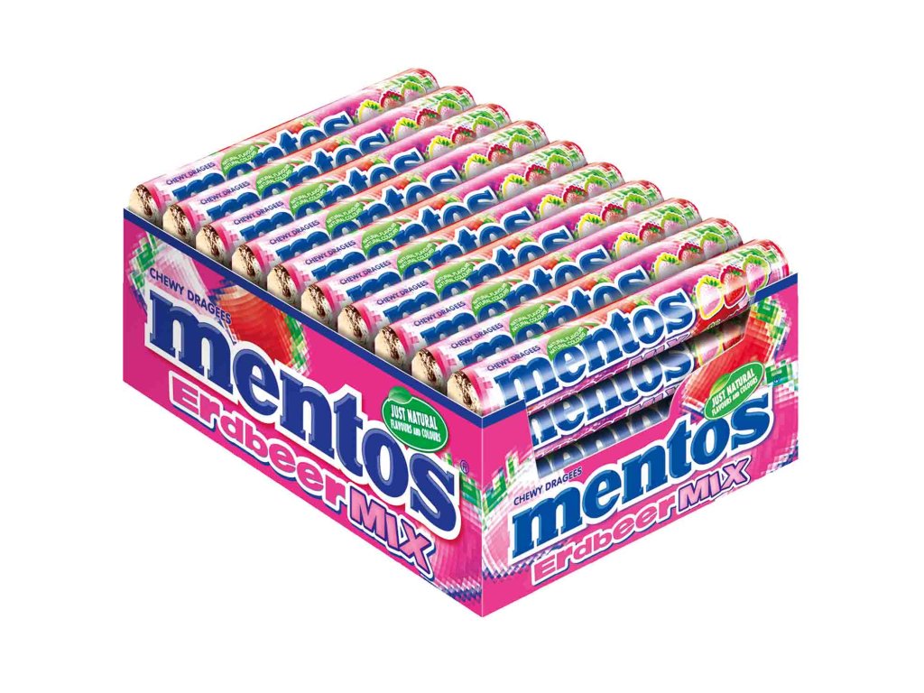 V roli. Mentos Strawberry Mix nabízí vše, co potřebujete k vychutnání oblíbeného červeného ovoce. Tato rolka obsahuje žvýkací dražé ve třech různých odrůdách bobulovin. Směs originálních, sladkých a kyselých jahodových dražé okamžitě zaujme a nabízí extra dávku rozmanitosti, pokud jde o ovocný požitek.