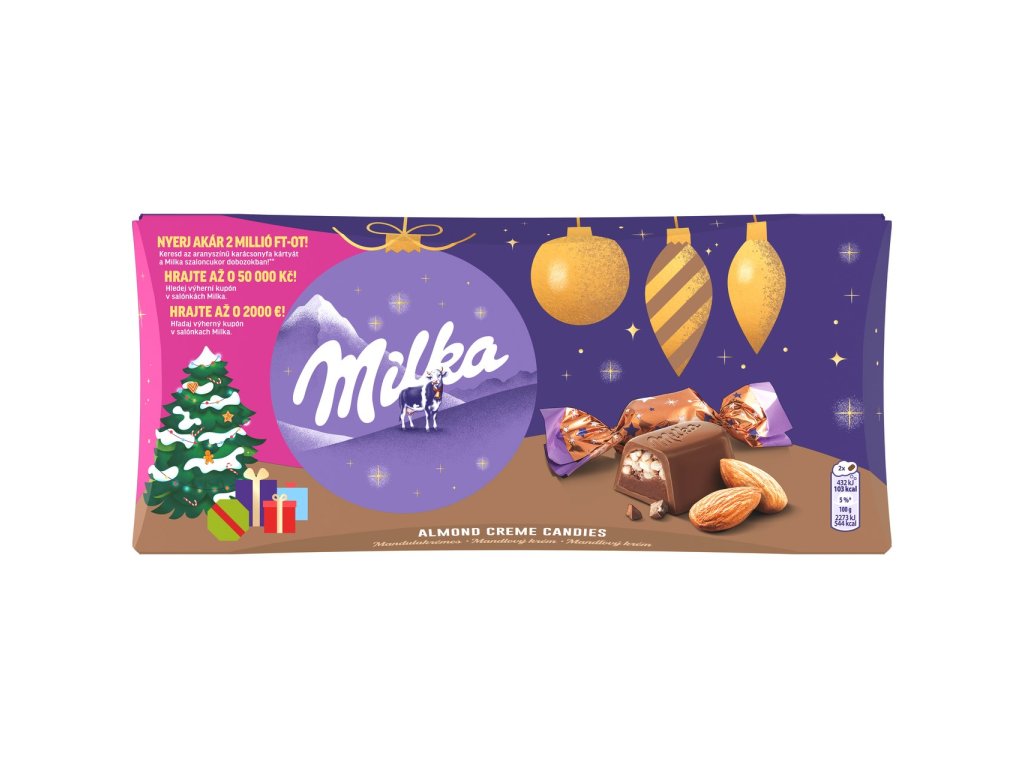 Složení Cukr, Kakaové máslo, Sušené odstředěné mléko, Kakaová hmota, Palmový olej, Mandlová hmota (5 %), Syrovátkový prášek, Mléčný tuk, Rýžová mouka, Emulgátory (sójové lecitiny, E476, E471), Lísková hmota, Sůl, Aromata