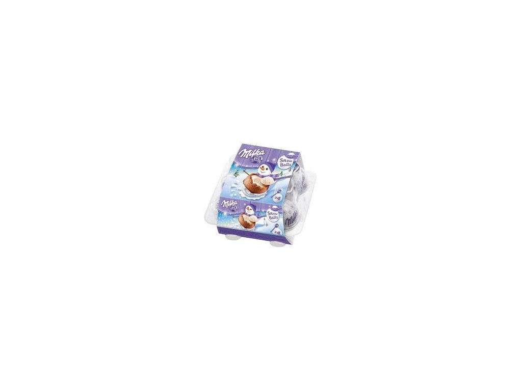 Milka Snow Balls 4x28g Balenie obsahuje 4 gule z mliečnej čokolády s mliečnou náplňou a 2 plastové lyžičky