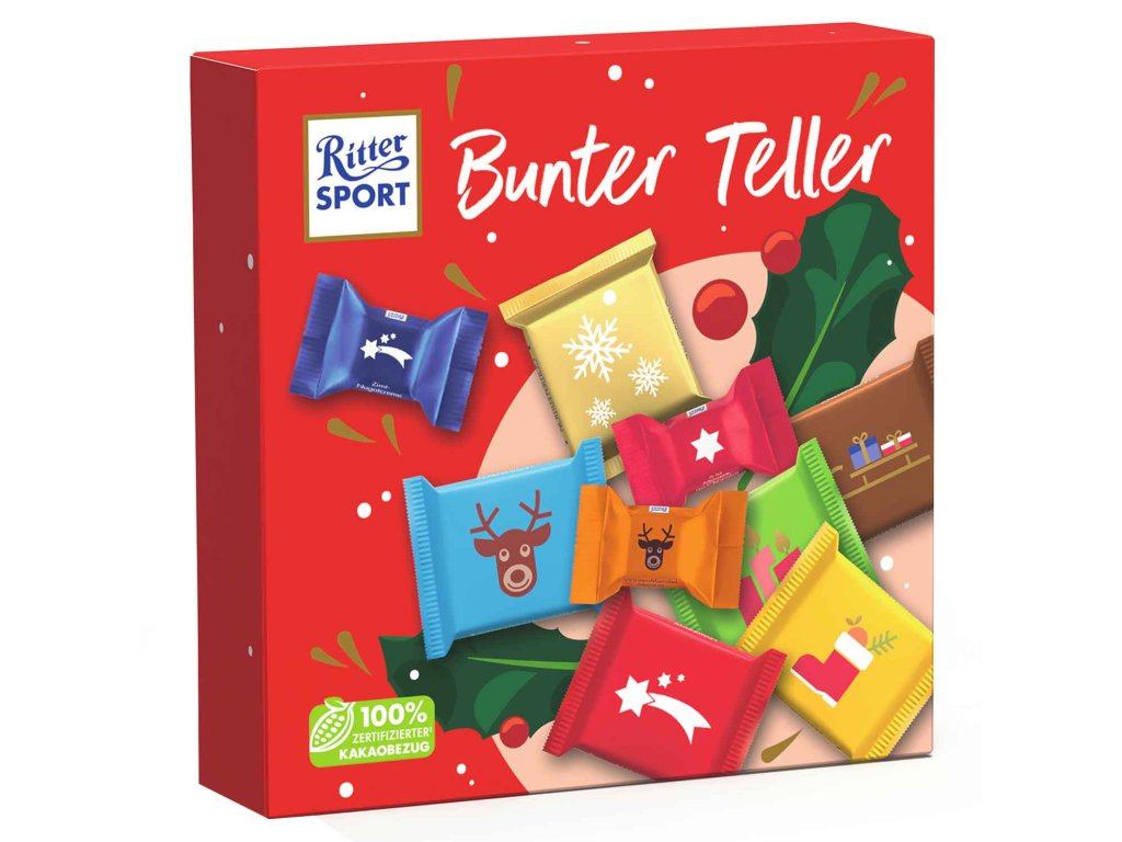 Sváteční mix. Ritter Sport Barevný talíř je mix 15 různých mini čokolád od oblíbené značky, které vypadají skvěle ve svém
