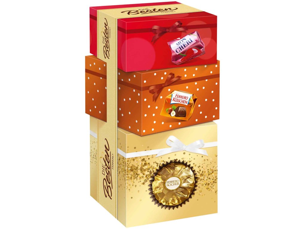 naplněných nejoblíbenějšími druhy pralinek: Mon Chéri, Ferrero Rocher a Ferrero Küsschen. Každá odrůda má svůj jedinečný charakter