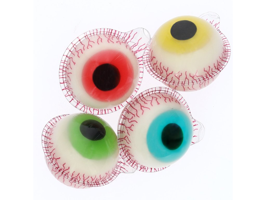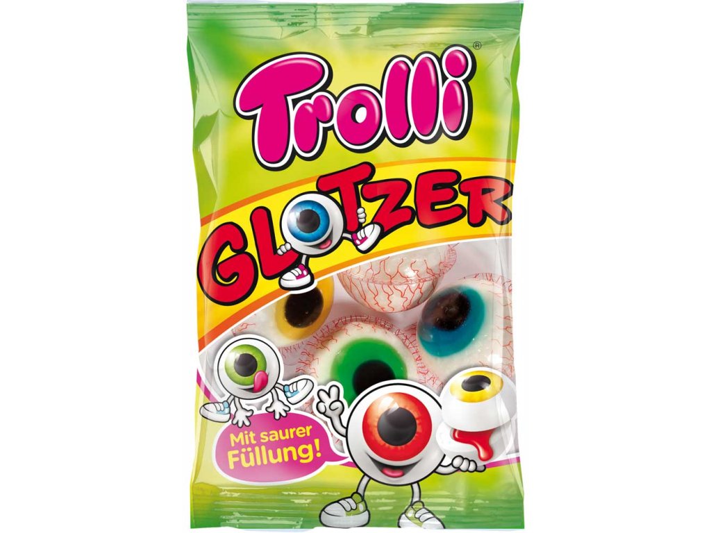 Strašidelne chutné. Kyslé plnené Trolli Glotzer sú skutočným šokom, pokiaľ ide o vzhľad a chuť. Zdá sa, že so svojimi veľkými zreničkami na vás pozerajú. Ak máte dosť odvahy zahryznúť sa do jedného z klamlivo skutočných ovocných očí vyrobených z marshmallow gumového cukríka, čaká vás super kyslá tekutá náplň. Individuálne zabalené oči z ktorých nielen deťom príjemne behá mráz po chrbte. Priemer je mimochodom cca 35 mm.