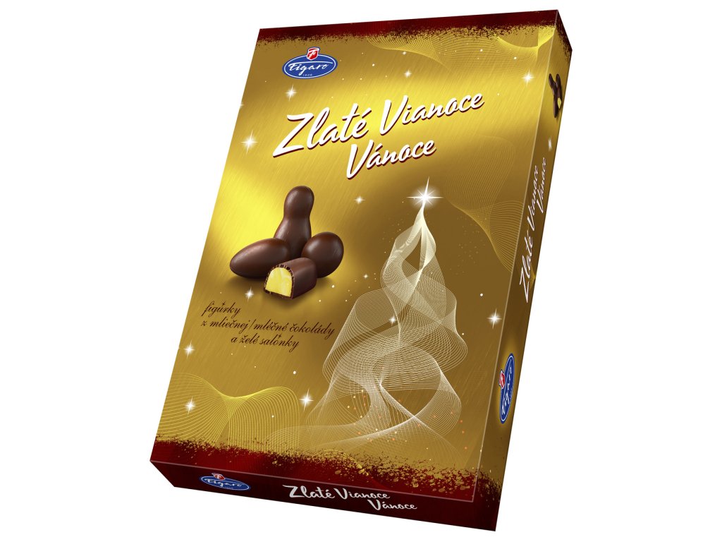 Vianočná kolekcia Zlatá Figaro 430g • duté figúrky z mliečnej čokolády a salóniky banánovej • bal .: 430g