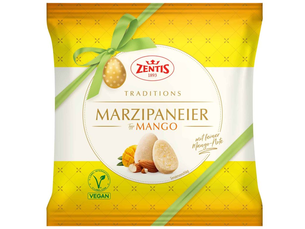 Zentis marcipánová vejce typu Mango spojují tradiční marcipán s exotickým nádechem: Jemné mandle se setkávají s ovocnou chutí sluncem zrajícího manga. Malé, vejčité lahůdky přesvědčí svou jemnou texturou a harmonicky sladěnou mango notou – ideální pro všechny, kteří si chtějí vychutnat marcipán ve speciální variantě.